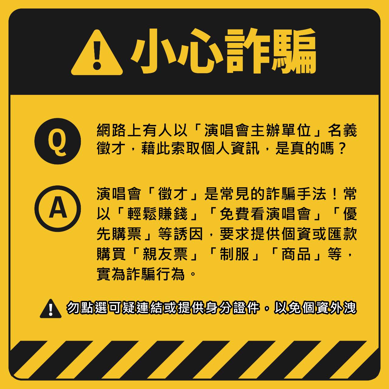 (三)網路上以「演唱會主辦單位」名義徵才,藉此索取個人資訊,為常見的詐騙手法。請勿點選可疑連結或提供身分證件,以免個資外洩,請以官方公告資訊為準。