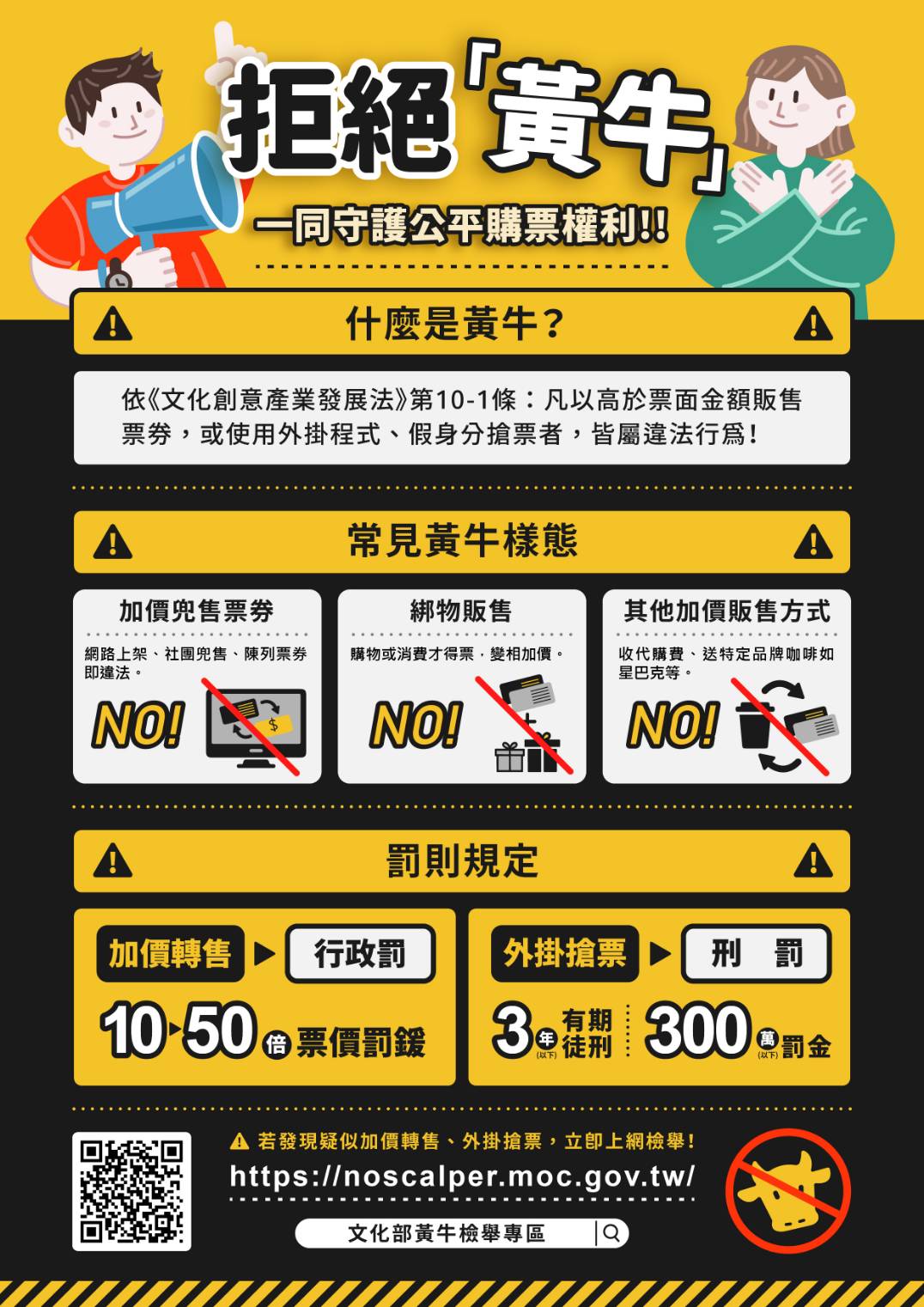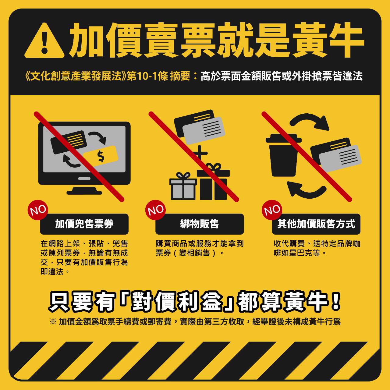 一、文化部於112年間增訂旨揭法規條文,就藝文表演票券常見的黃牛行為「加價轉售」及「以不正方式取得票券」加以規範。