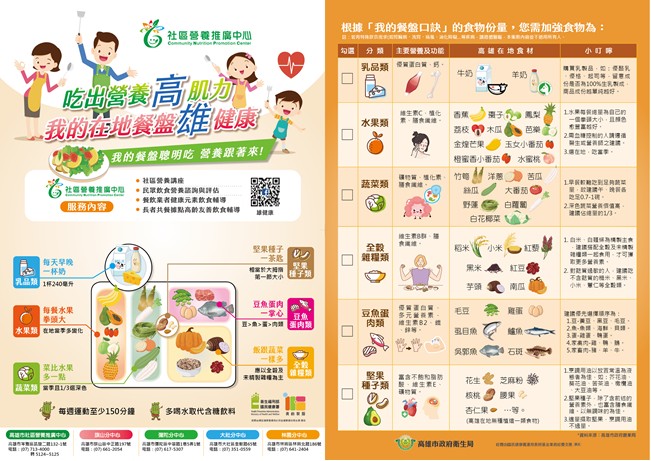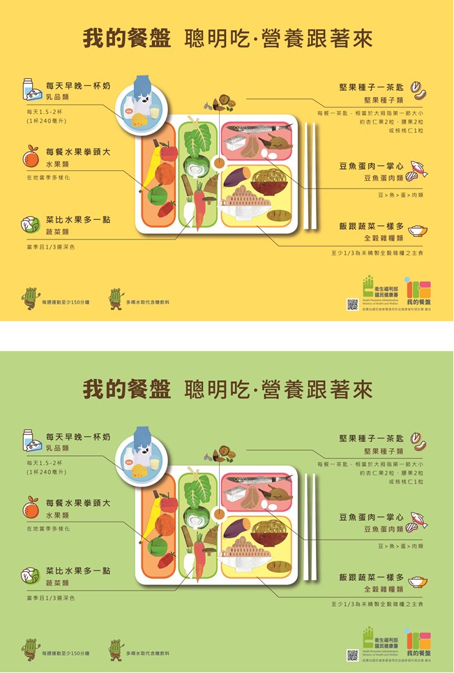一 、國民健康署於107年公布「我的餐盤」圖像,將每日應攝取的六大類食物:全穀雜糧、豆魚蛋肉、蔬菜、水果、乳品與堅果種子以圖像呈現,並設計6句簡易口訣「每天早晚一杯奶、每餐水果拳頭大、菜比水果多一點、飯跟蔬菜一樣多、豆魚蛋肉一掌心、堅果種子一茶匙」,讓民眾利用拳頭、掌心即可暸解每餐六大類食物要吃的量。為了更加融入民眾生活