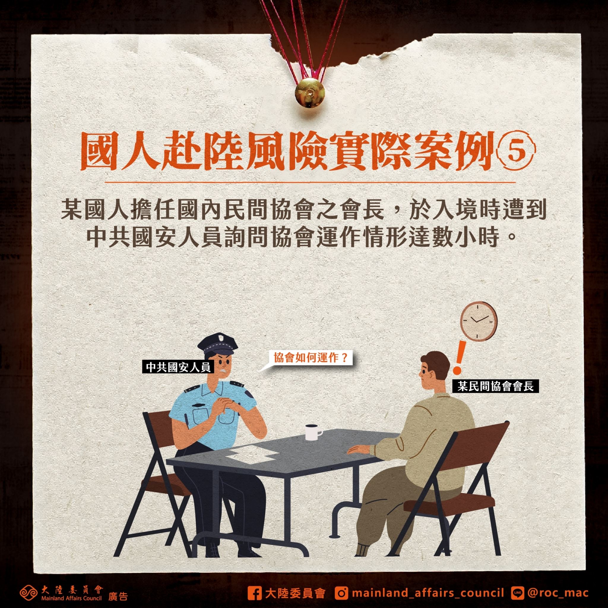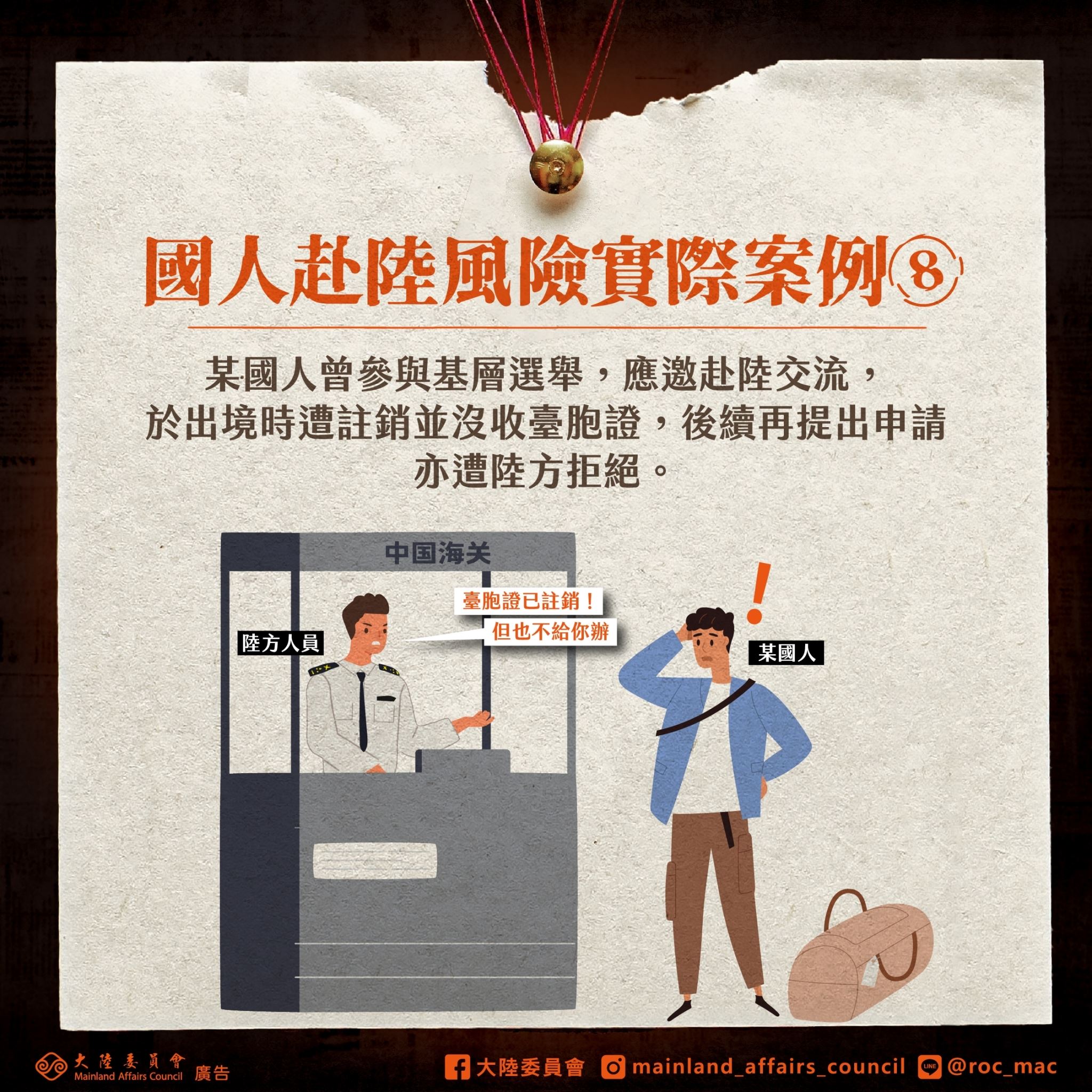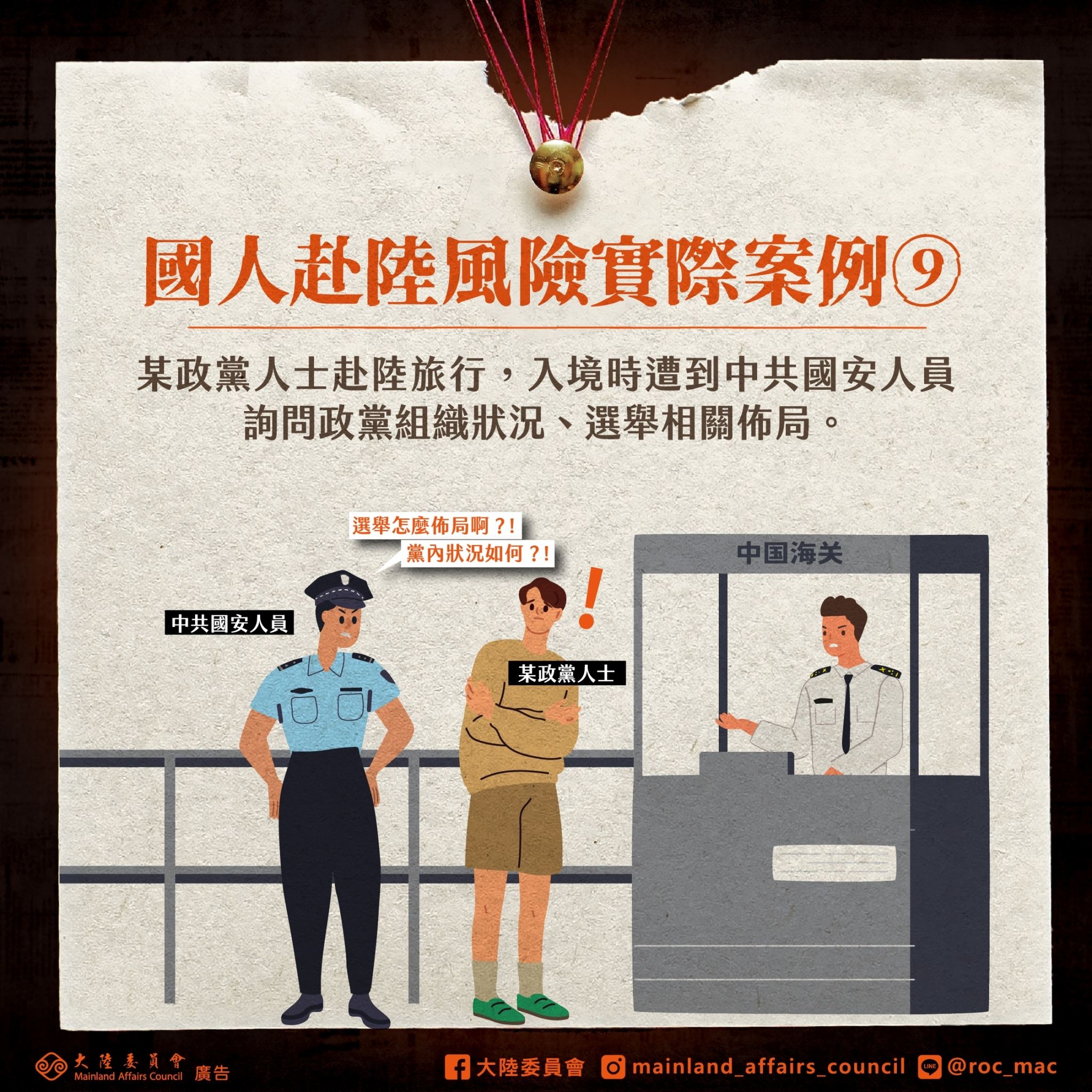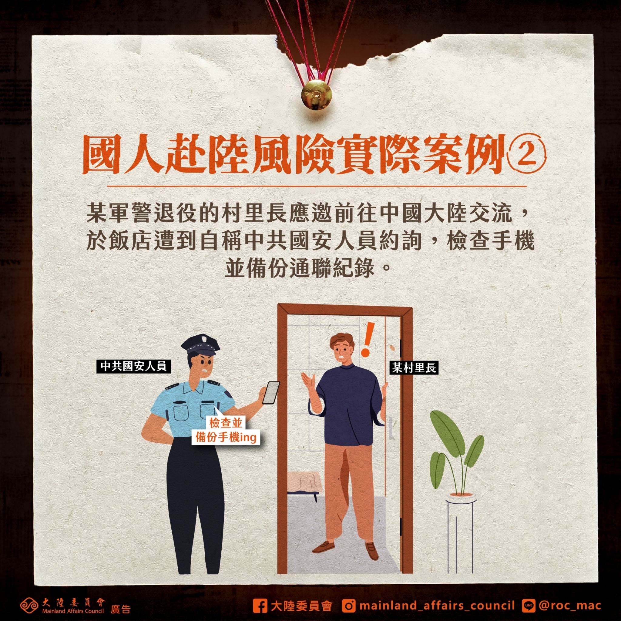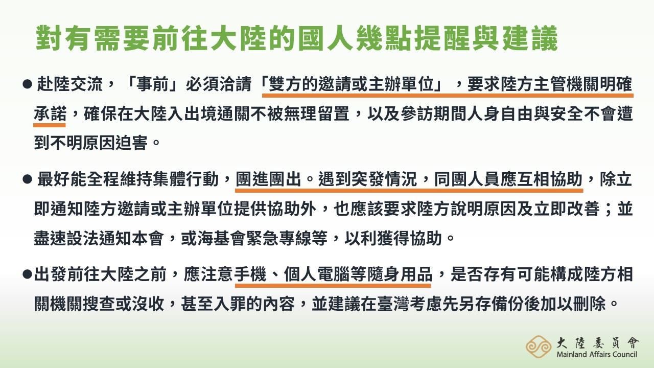 二、國人赴陸旅遊風險持續升高,村(里)民赴陸參訪等交流活動,務必審慎評估辦理赴陸交流活動之妥適性,以確保里民參加活動之安全。